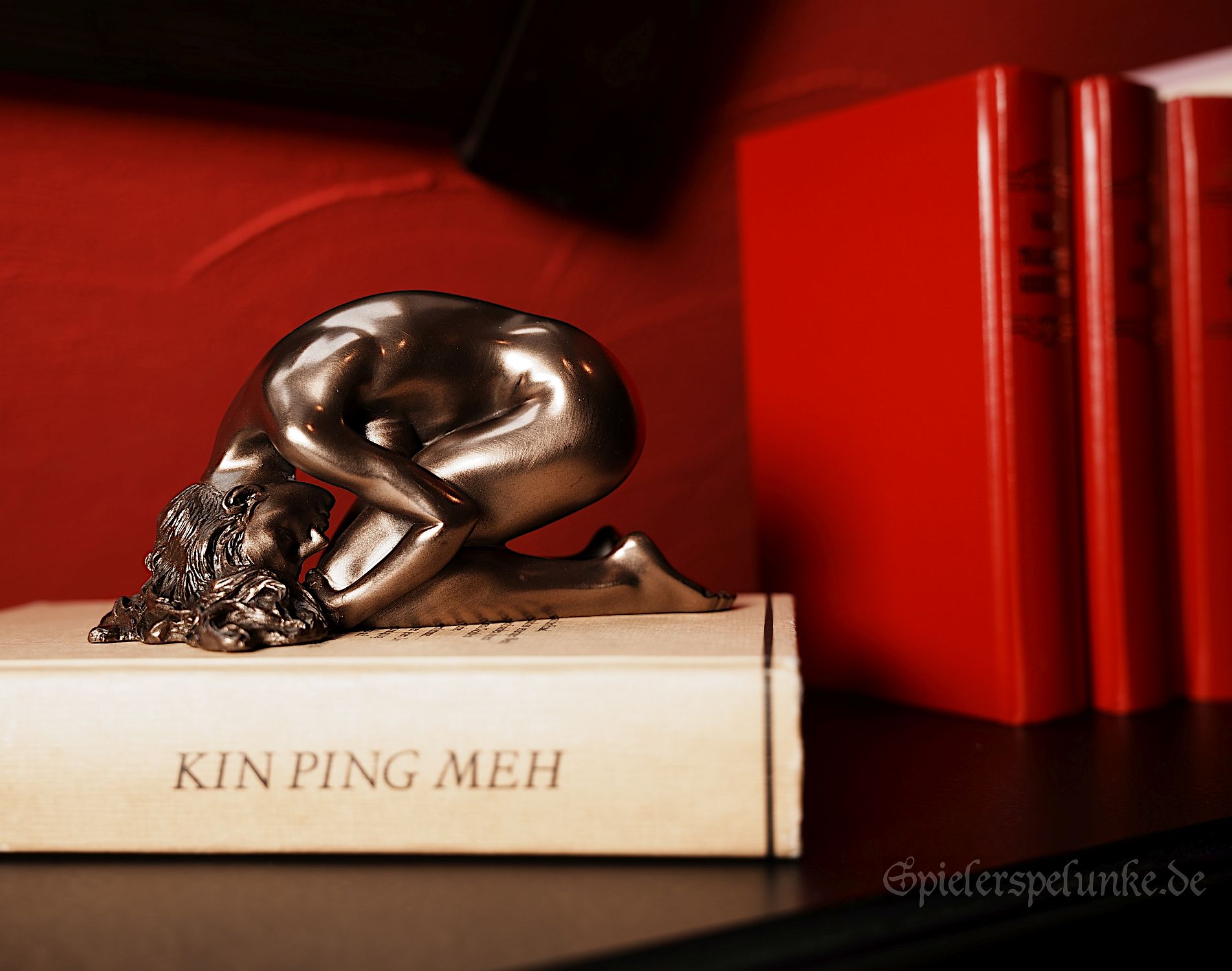 Kleine Bronzestatue, ca. 7 x 7 x 14cm groß, eine nackte Frau darstellend, auf dem Boden kniend, die Stirn am Boden. Der Ausdruck dieser Statuette ist dem "Kowtow" entsprechend, das eine chinesische Geste der Ehrerbietung und Unterwerfung benennt.Ein sehr schöner Schmuck für den Kaminsims, das Fensterbrett oder das Sideboard.