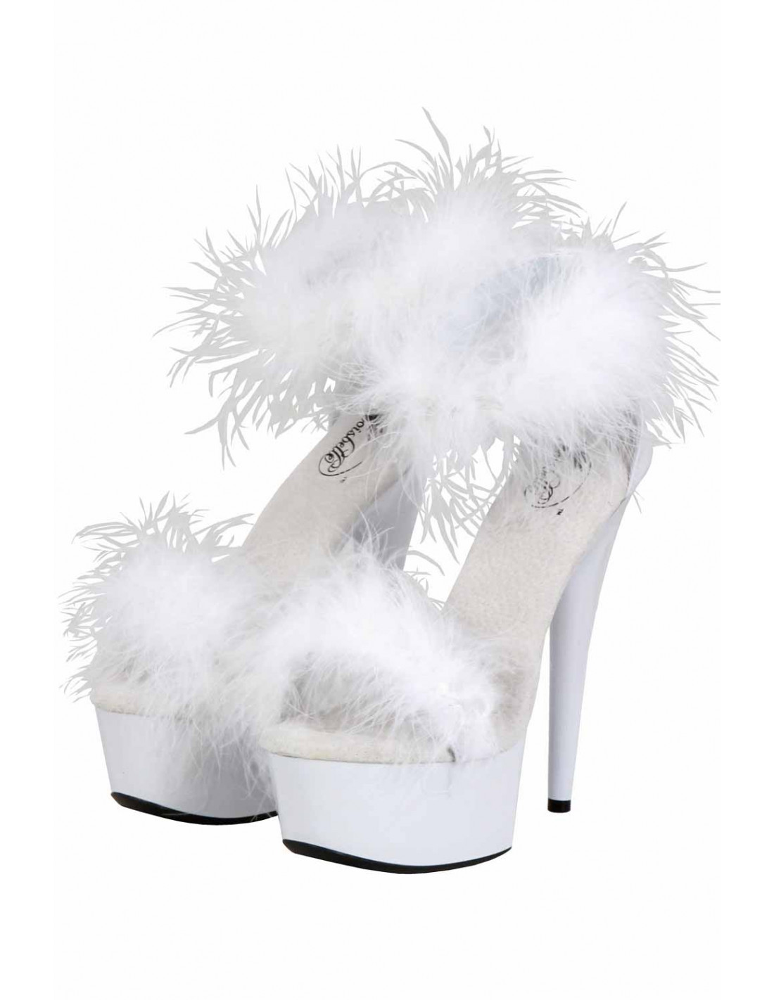 High Heel Plateau Sandale weiß mit 14cm Absatz und 4cm Plateau. Plateausohle und Pfennigabsatz in Lack weiß, Zeh- und Fesselriemchen mit weißen, weichen Flaumfedern besetzt und die Innensohle weich unterfüttert aus silbergrauem Velourleder. An der Ferse mit einem kurzen Reißverschluß zu verschließen.
