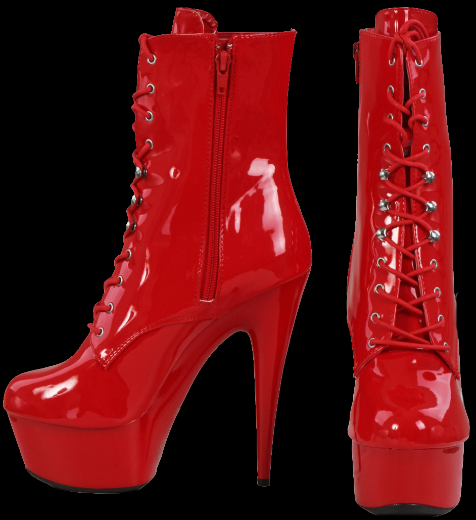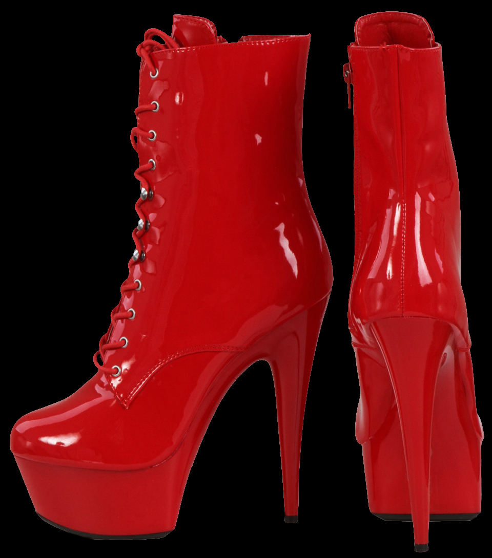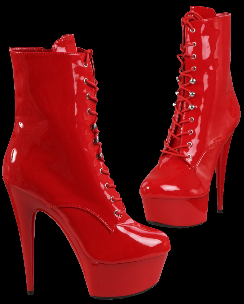 Plateau Lack Stiefelette im leuchtenden Lackrot mit einem 14,5cm Pfennigabsatz und 5cm Plateau. Mit einer Schnürung und einem Innenreißverschluß verschließbar