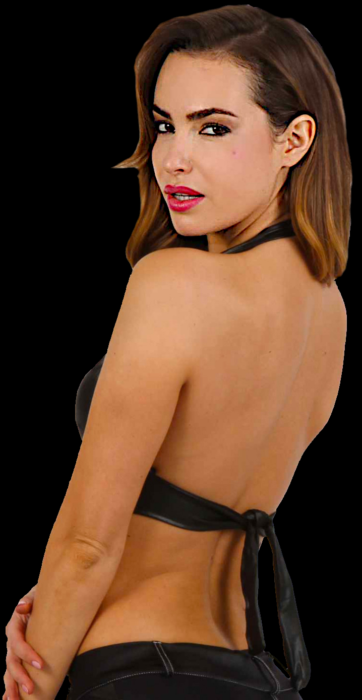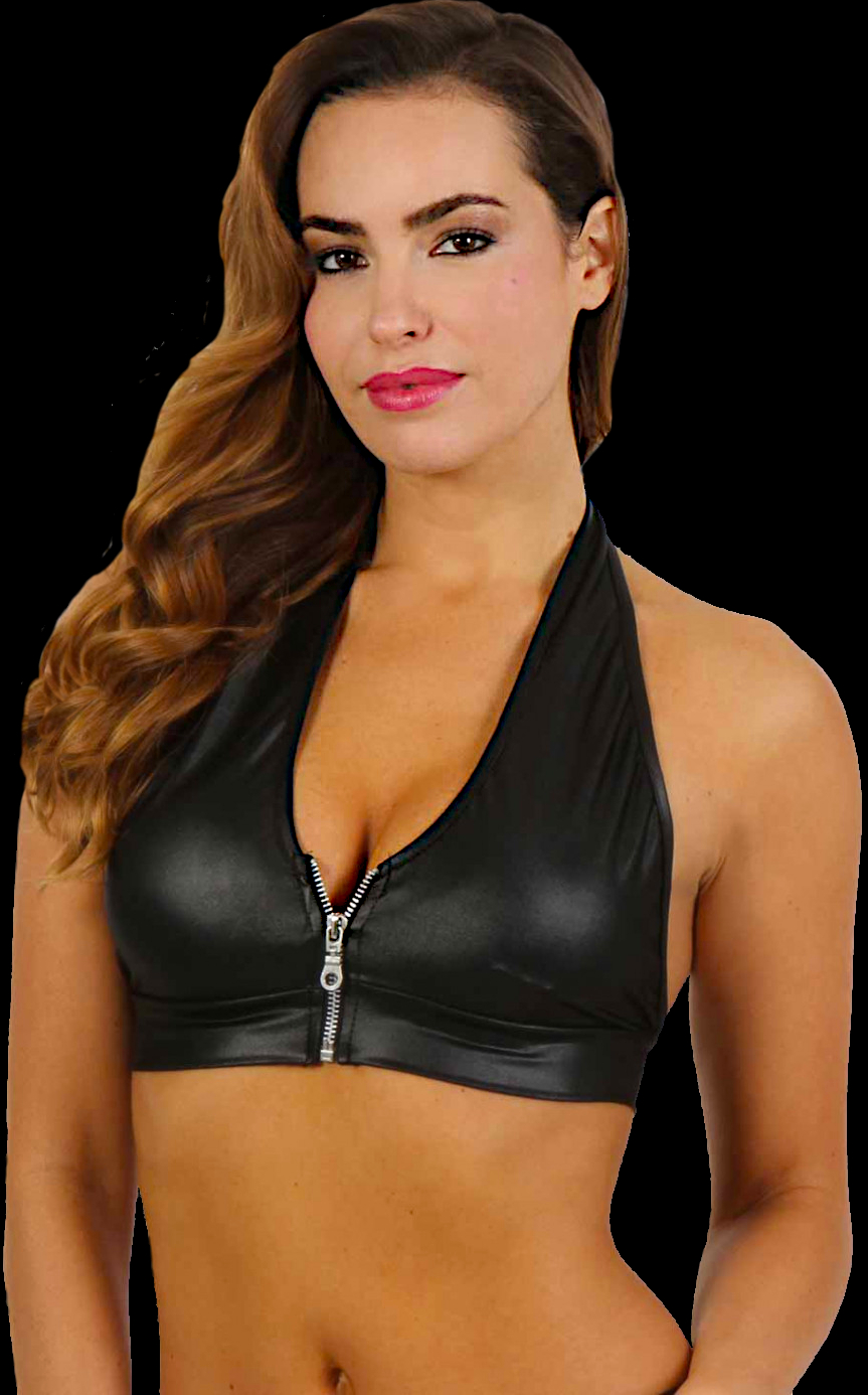Knappes BH-Top in schwarzem Wetlook mit Neckholder, vorn mit Reißverschluss, hinten zum Binden