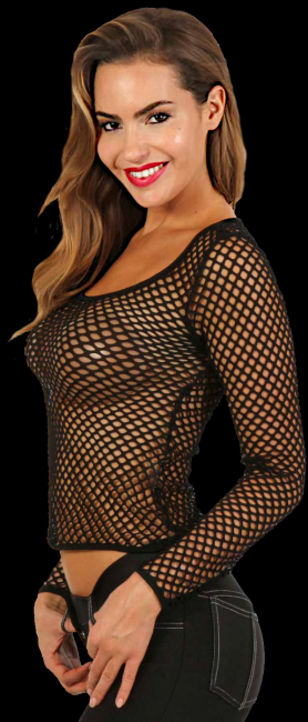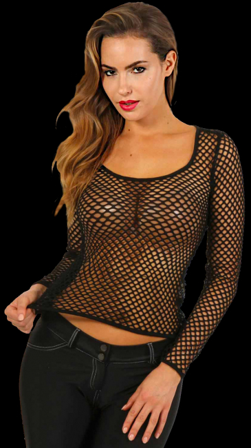 Kaum verhüllendes, grobmaschiges Netz-Top mit Langarm aus hochelastischem Material. Mit Korsett, Rock, BH oder gar nichts wunderschön kombinierbar.