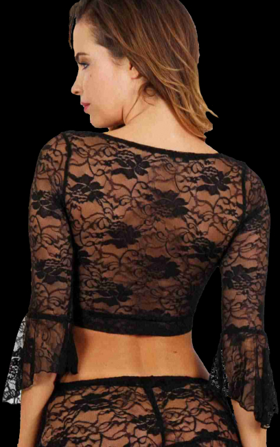 Schwarzes Bolero-Top aus Spitze mit transparentem, floralem Muster, vorn zum Binden mit dreiviertel-Arm.