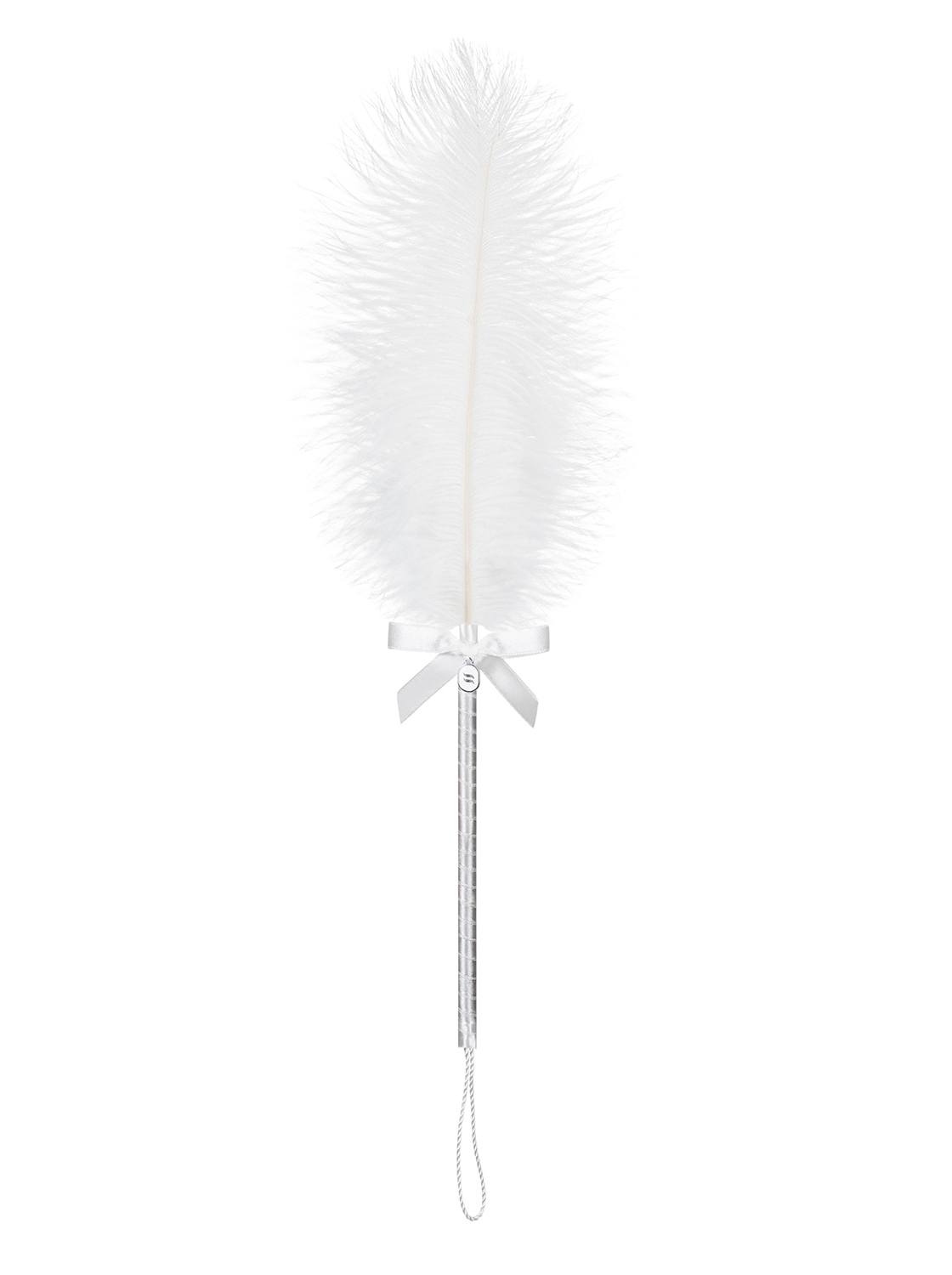 Erwachsenen-Spielzeug für intime Stunden mit einer weißen, weichen Feder, die mit einer Satinschleife an einem weißen Stab mit Schlaufe befestigt ist.