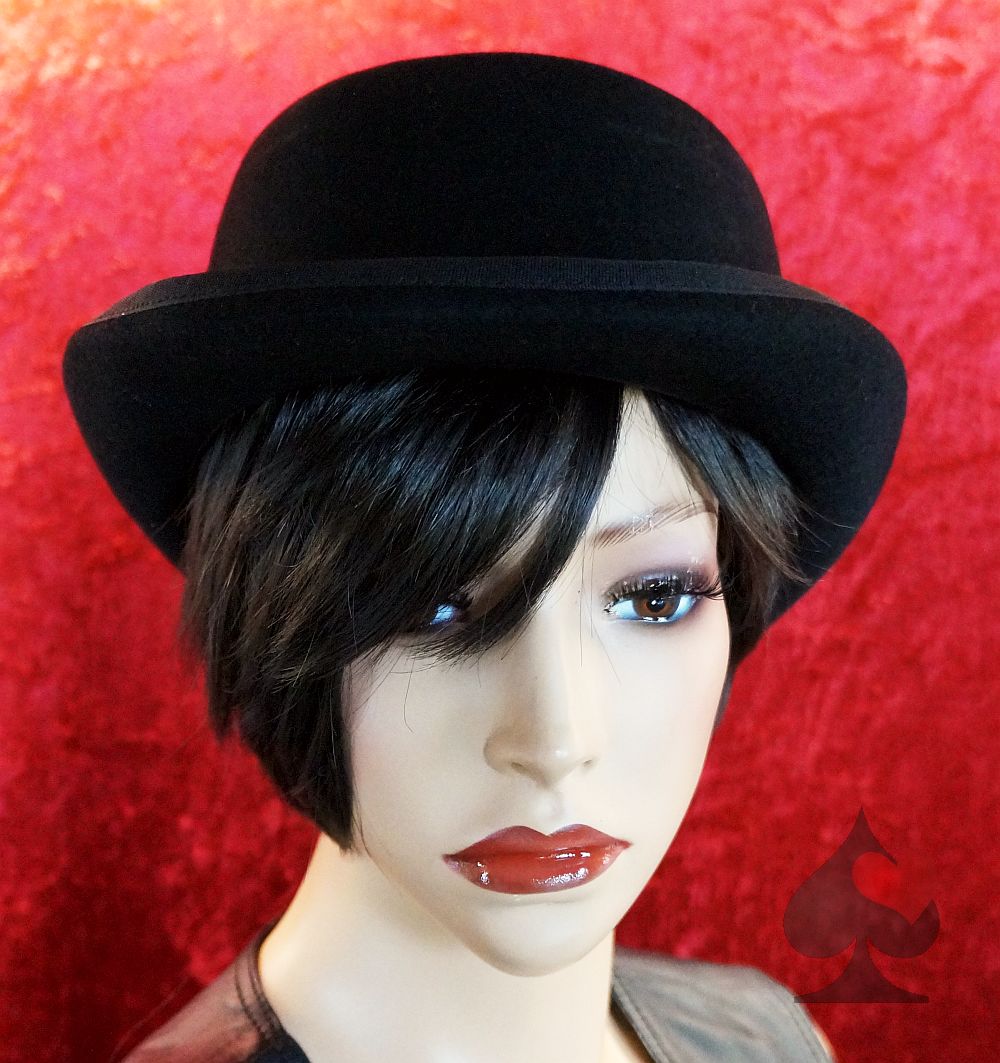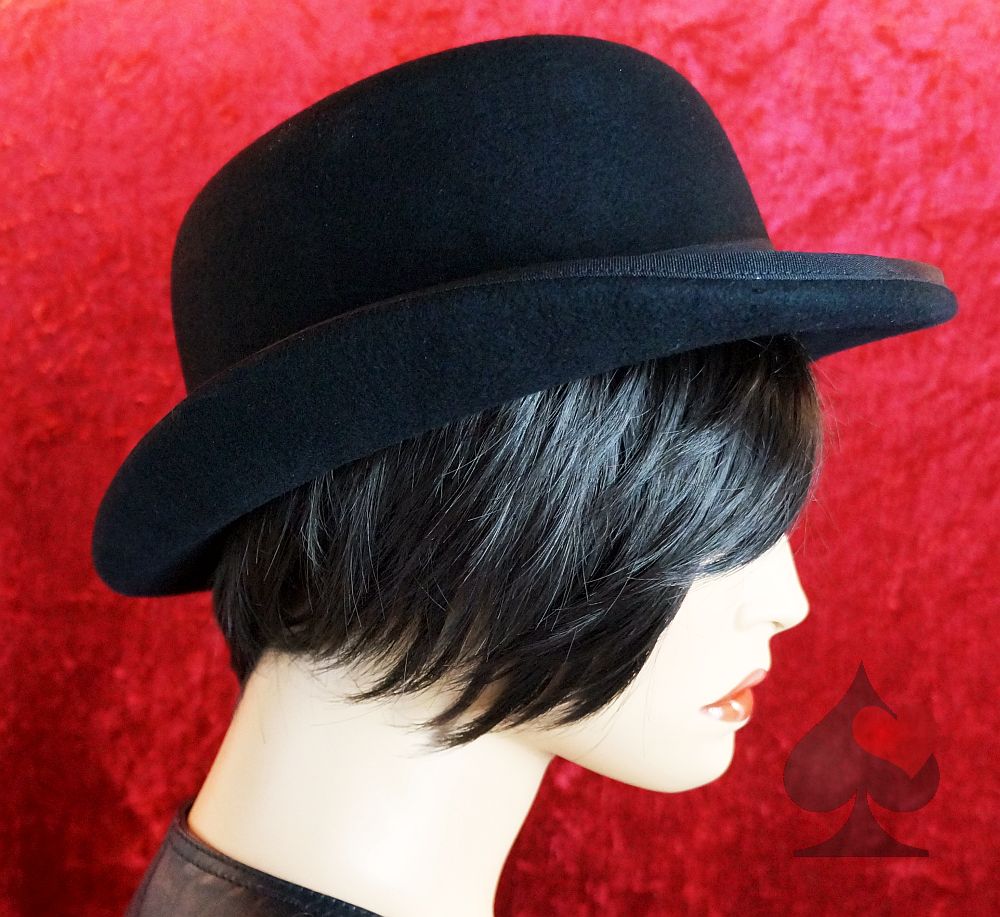 Schwarze Steampunk und Burlesque Melone aus Wollfilz. Der Hut ist mit einem schwarzen Hutband oberhalb der aufgewölbten Krempe versehen und die Krempe ist mit einem schwarzen Band umsäumt. Innen ist die Melone mit weißem Satin ausgeschlagen. Der Hut ist ca. 11 cm hoch. Mit Krempe ist der Hut ca. 30 x 23cm groß.