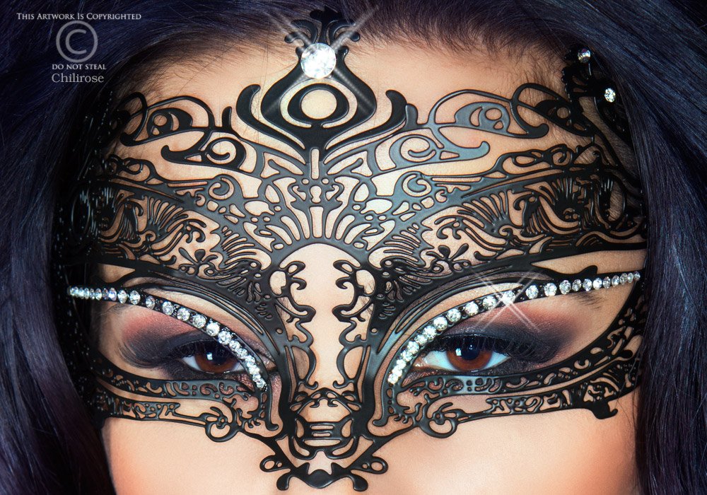 Jede Dame hat ein Geheimnis und dieses kann sie stilecht hinter einer solchen verführerisch schönen Maske verwahren. Die schwarze Maske ist besonders hoch und bedeckt damit fast die gesamte Stirn. Sie ist aus Messing filigran gefertigt, mit Strasssteinen verziert und mit einem Satinband zur Fixierung versehen. Durch leichtes Biegen kann die Maske perfekt angepasst werden.