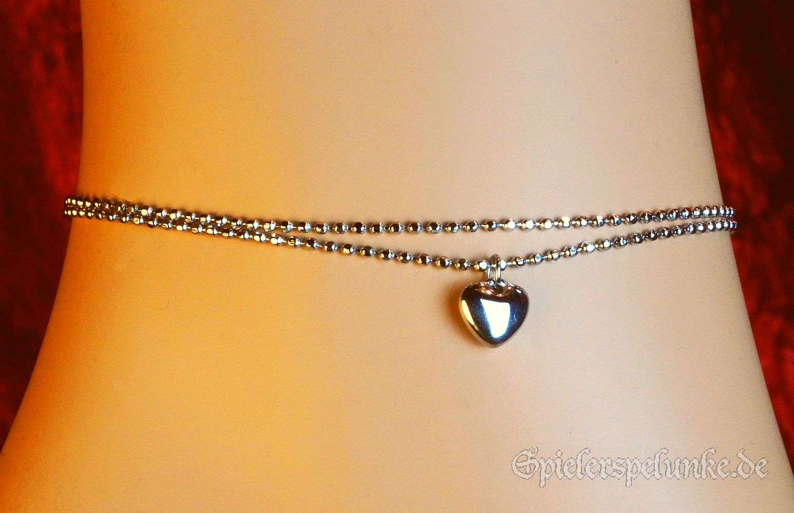 Doppellagiges silberfarbenes Edelstahl Fußkettchen mit kleinem glanzpoliertem 3D-Herzanhänger . Die kleinste einstellbare Länge ist 22cm, die längste 26cm.