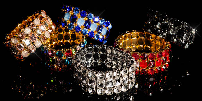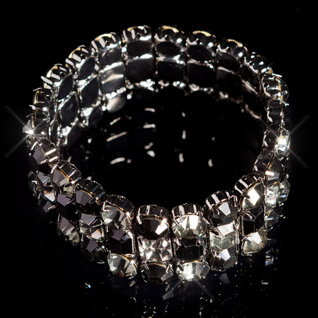 Ideal für Abendkleid und Show: sehr glamouröses Stretch-Armband aus drei Reihen großer, glitzernder, schwarzer Strasssteine in zwei Größen in schwarzer Metallfassung.
