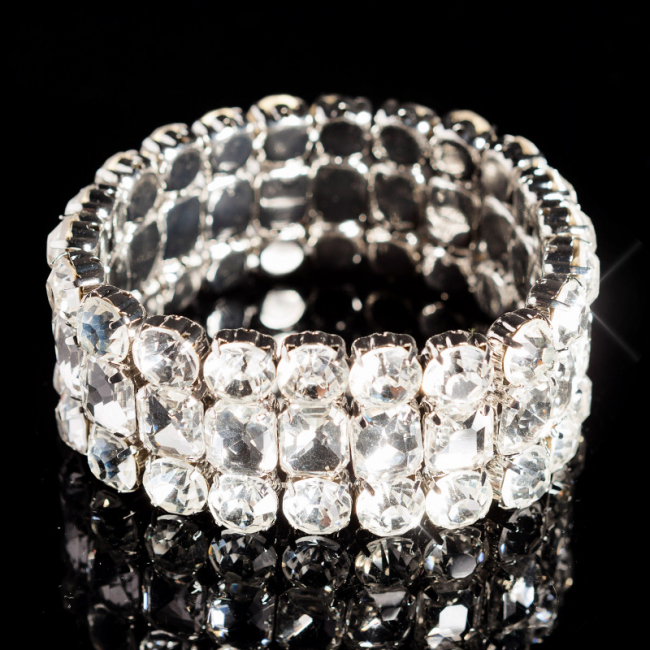 glitzerndes Stretch-Armband mit 3 Reihen großen, weißen Strasssteinchen in Metall gefasst