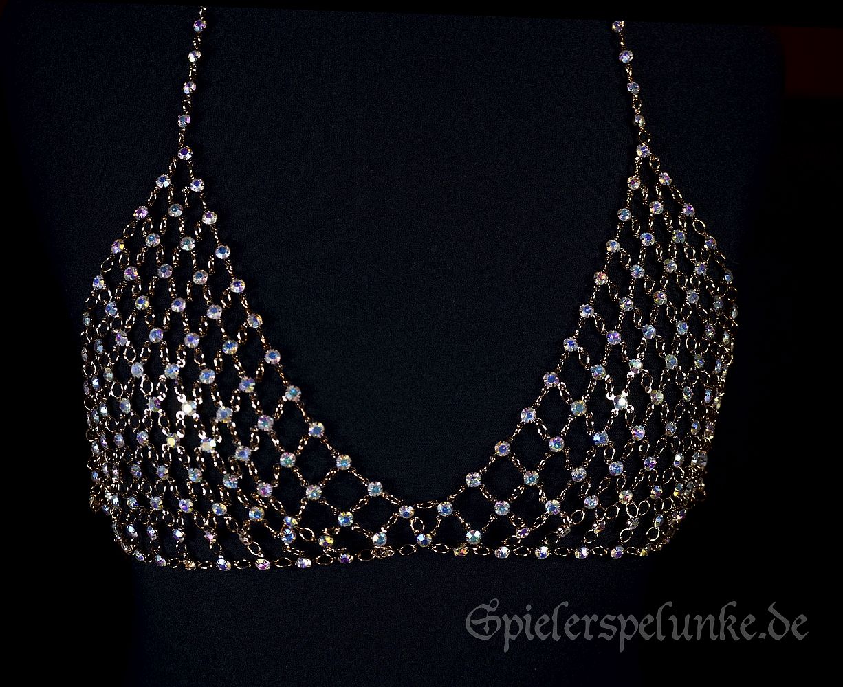 Ganz sicher nicht geeignet, um etwas zu verbergen, wohl aber unbedingt, um etwas zum Strahlen zu bringen. Filigraner, glitzernder Körperschmuck in Form eines wunderschönen Bikinis aus kleinen, goldfarbenen Kettenelementen zwischen gefassten, strahlenden Strasssteinchen. Ob auf einem hautengen Kleid oder auch gleich direkt auf der nackten Haut getragen - dieser Schmuck wird Dein natürliches Strahlen ganz sicher verstärken