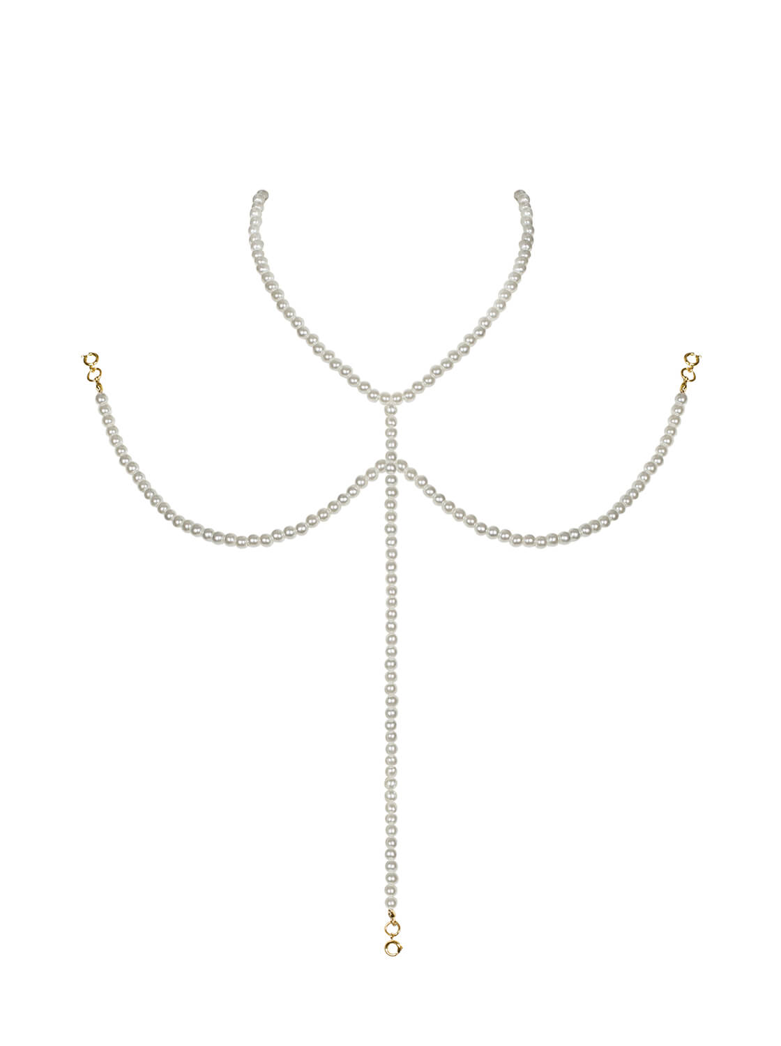 Ein raffiniertes Schmuckstück für Hals und Dekolleté, dessen Enden jeweils zum BH der Dame führen und dort befestigt werden. So endet jede Erkundungstour dort, wo es am schönsten ist! Die Perlen haben einen schönen, weißmatten Glanz, fast wie die echten Perlmutt-Schwestern. Im Nacken kann die Halskette über Metallglieder in der gewünschten Länge geschlossen werden, damit am Ende alles dort sitzt, wo es soll.