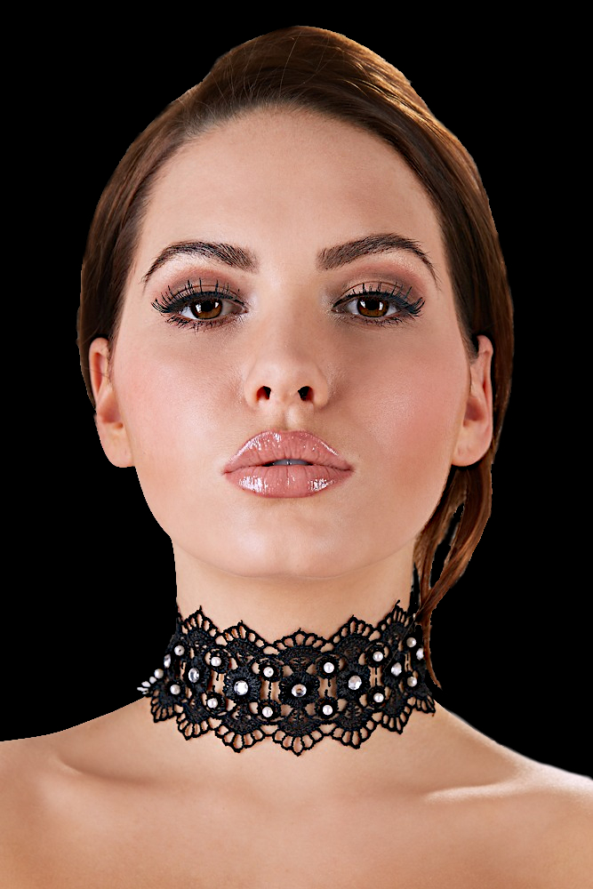 Gestricktes Halsband, schwarz mit Perlen und Strasssteinchen besetzt. Hinten mit Satinschleife zu binden. Ca. 5cm breit und 33cm lang.