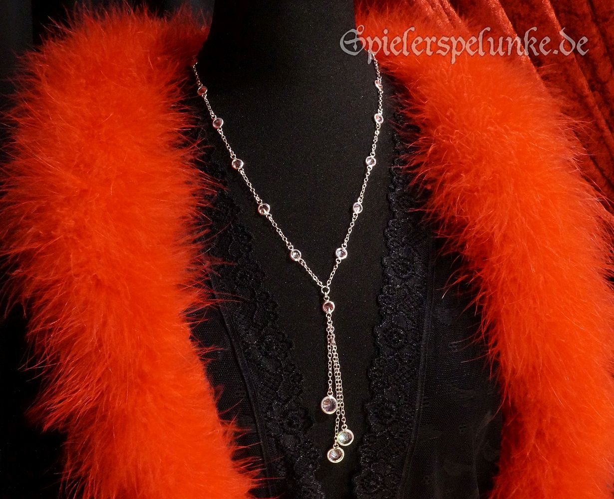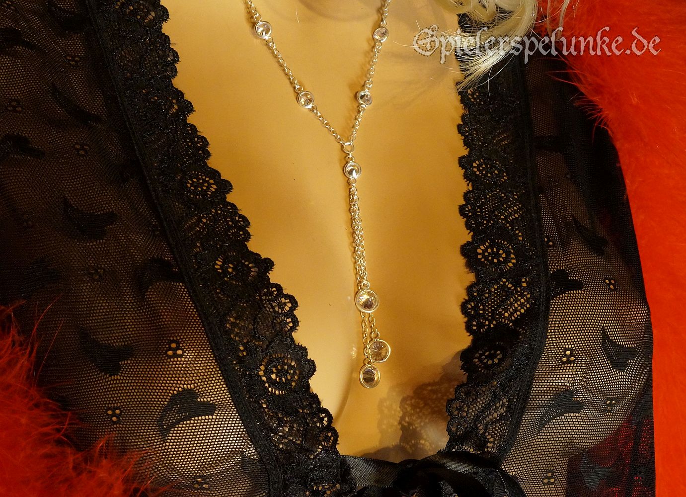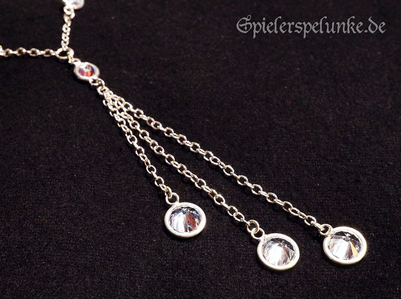 Silberne Halskette Silber Collier mit eingearbeiteten Kristallornamenten und einem Y-Abschluss eingerahmt von zwei transparenten Kristallschmucksteinen. Die Silber Halskette kann mit einer Länge von 50 bis 55cm zuzüglich des Y-Motives getragen werden.