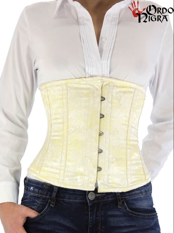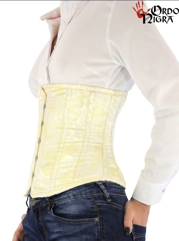 Elegantes und schlichtes Unterbrustkorsett aus beigefarbenem Brokat. Vorn wird das edle Korsett mit einr Planchettefront aus Edelstahl verschlossen. Durch die rückseitige Schnürung kann das Korsett genau auf die Trägerin abgestimmt werden. Eine Rückenschutzlasche schützt den Rücken und gibt der Schnürung den optischen Hintergrund. Halt bekommt die Trägerin durch eingearbeitete Stäbchen aus geflochtenem Edelstahl, wie es bei Markenkorsetts üblich ist. Dieser Halt unterstreicht eine stolze, aufrechte Haltung und betont die elegante Bewegung.