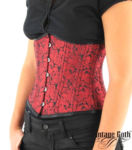 Sehr edles Unterbrustkorsett aus schwarz rotem Brokat mit floralem Muster. Vorn wird das edle Korsett mit einer Planchettefront aus Edelstahl verschlossen. Durch die rückseitige Schnürung kann das Korsett genau auf die Trägerin abgestimmt werden. Eine Rückenschutzlasche schützt den Rücken und gibt der Schnürung den optischen Hintergrund. Halt bekommt die Trägerin durch eingearbeitete Stäbchen aus geflochtenem Edelstahl, wie es bei Markenkorsetts üblich ist. Dieser Halt unterstreicht eine stolze, aufrechte Haltung und betont die elegante Bewegung.