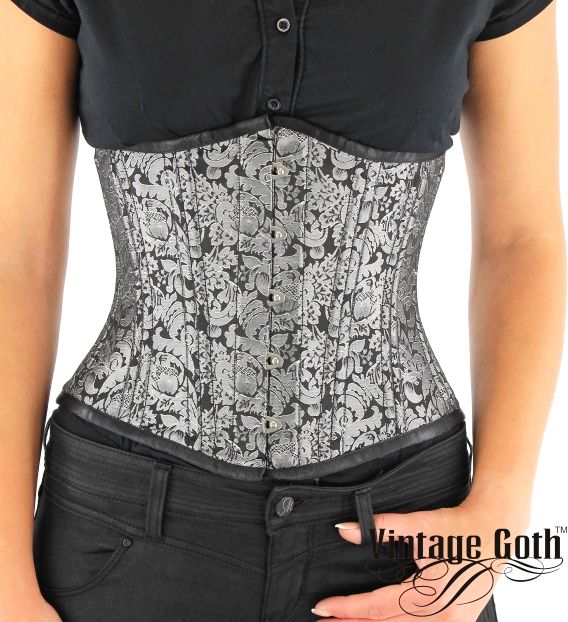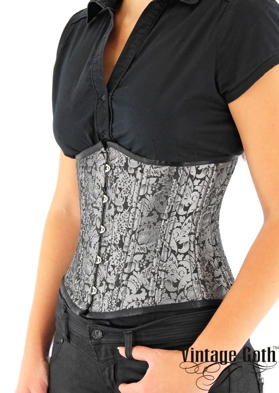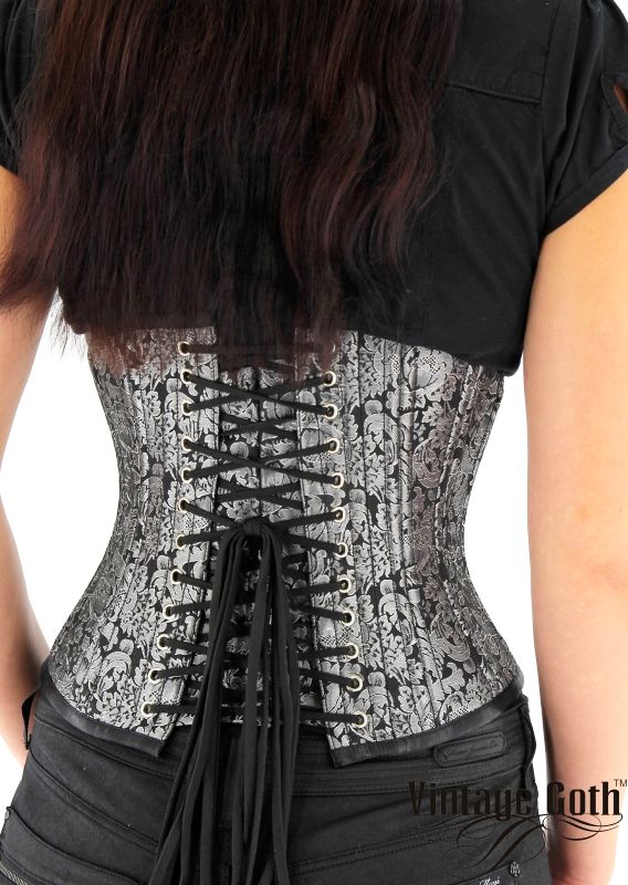 Sehr edles Unterbrustkorsett aus schwarz silbernem Brokat mit floralem Muster. Vorn wird das edle Korsett mit einer Planchettefront aus Edelstahl verschlossen. Durch die rückseitige Schnürung kann das Korsett genau auf die Trägerin abgestimmt werden. Eine Rückenschutzlasche schützt den Rücken und gibt der Schnürung den optischen Hintergrund. Halt bekommt die Trägerin durch eingearbeitete Stäbchen aus geflochtenem Edelstahl, wie es bei Markenkorsetts üblich ist. Dieser Halt unterstreicht eine stolze, aufrechte Haltung und betont die elegante Bewegung.