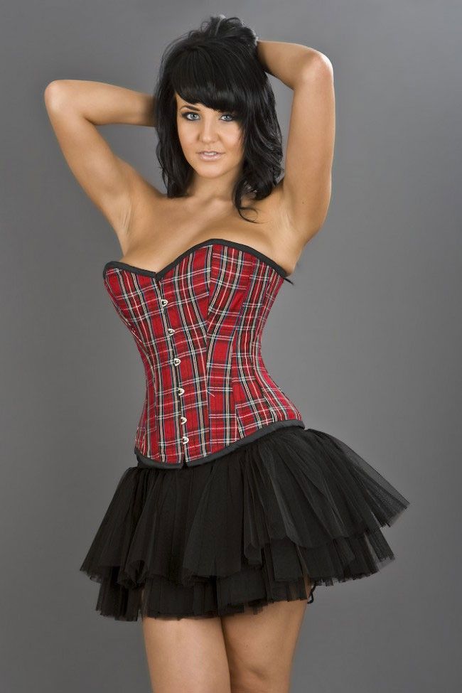 Freches Überbrustkorsett aus rotem Schottenmuster-Baumwollstoff. Vorn wird das edle Korsett mit einer Edelstahl-Hakenleiste verschlossen. Durch die rückseitige Schnürung kann das Korsett genau auf die Trägerin abgestimmt werden. Eine Rückenschutzlasche schützt den Rücken und gibt der Schnürung den optischen Hintergrund. Halt bekommt die Trägerin durch eingearbeitete Stäbchen aus geflochtenem Edelstahl, wie es bei Markenkorsetts üblich ist. Dieser Halt unterstreicht eine stolze, aufrechte Haltung und betont die elegante Bewegung.