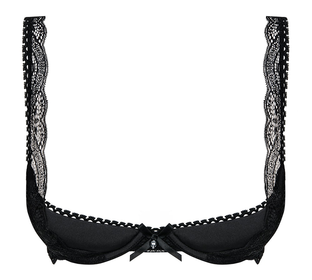 Edler schwarzer Brust Heber aus Stretchstoff mit Bügel-Cups, verstellbaren Trägern und Häkchenverschluß. Geschmückt mit aufgesetzter Spitze, einem filigranen Spitzenabschluß der Cups, einer kleinen Schleife zwischen den Cups und Trägern in feiner Spitze.