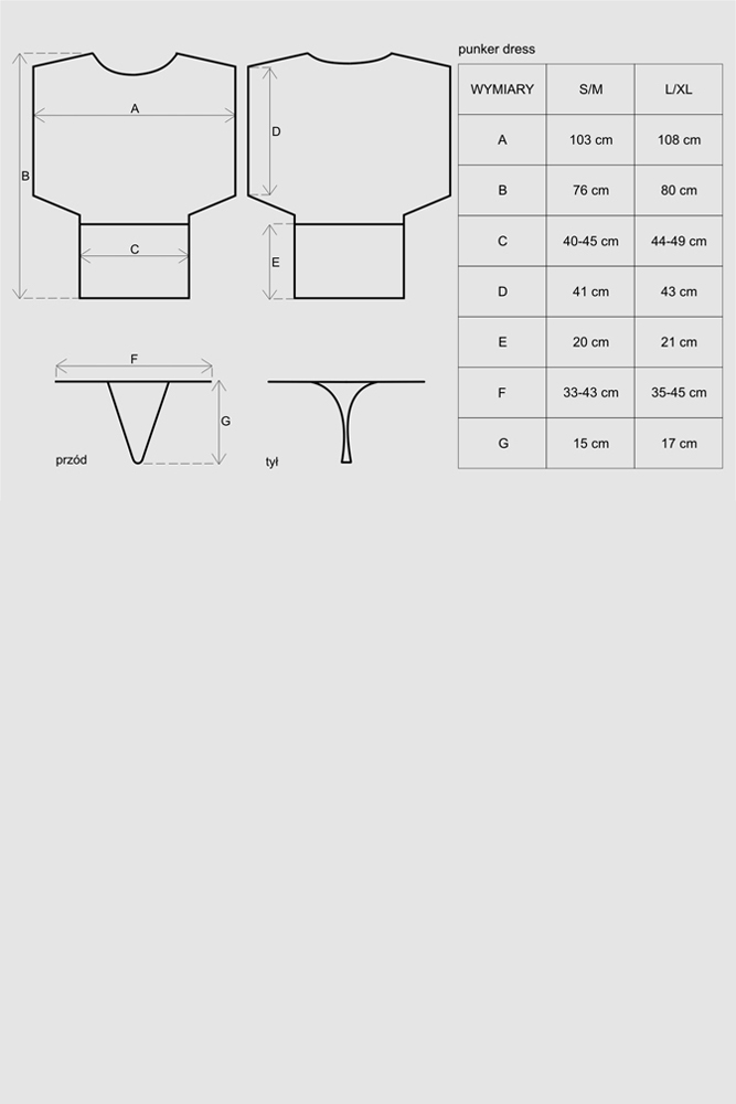 Dieses Minikleid ist eigentlich nur ein sehr breiter "Gürtel" aus sehr weichem und blickdichtem Material. Daran schliesst sich ein weites, transparentes, schwarzes Netztop mit Flügelärmeln an. Pur getragen sicher nicht für die ganz öffentliche Veranstaltung geeignet, wohl aber mit edler Underwear. Vorder- und Rückseite dieses heißen Teiles sind identisch und ein sexy String ist inklusive.