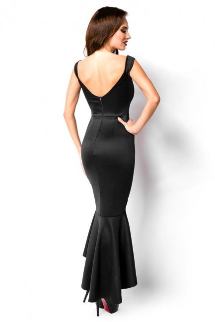 Extravagantes elegantes Abendkleid mit figurbetonter Meerjungfraulinie durch den ausgestellten Volant am Rocksaum. Leicht wattierte Cups sind für ein besonderes Dekollete eingearbeitet. Nahtfeiner Reißverschluss in der hinteren Mitte, der Rücken ist nur halb bedeckt