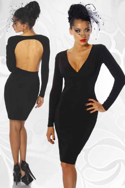 Wirkungsvolles schlichtes elegantes Kleid knielang mit langen Ärmeln, tiefem V-Ausschnitt für ein tolles Dekollete und hinten rückenfrei
