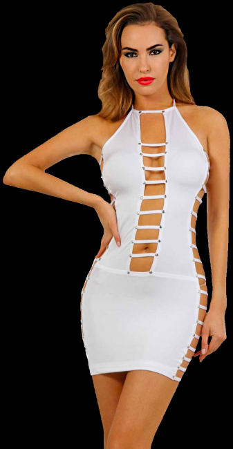 Tiefer kann nun wirklich kein Einblick gewährt werden! Der verführerisch tiefe Dekolleté-Ausschnitt dieses weissen Clubkleides hört erst unterhalb des Nabels auf und wird mit kleinen, vernieteten Riemchen verriegelt. Die Seiten sind über die gesamte Länge ausschliesslich nur mit diesen Riemchen bedeckt. Das verwirrt die Sinne garantiert! Oben wird das Minikleid durch schmale Bänder als Neckholder gehalten. Der Stoff ist hauchdünn, elastisch und sehr angenehm zu tragen.