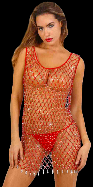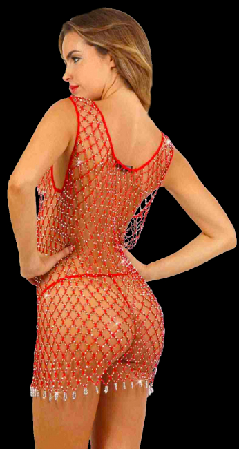 Rotes Netztop mit farbig glitzernden Strasssteinchen besetzt