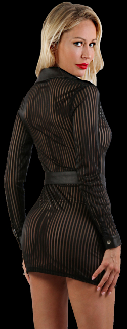 Transparentes, langärmeliges Minikleid mit Längsstreifen, geschnitten wie ein Mantel der 70er, jedoch nicht so wärmend, dafür mit verführerischen Einblicken. Vorn mit einer durchgehenden Druckknopfleiste, am Hals ein klassischer Mantelkragen, breite Manschetten an den Ärmeln und ein breiter Gürtel mit silberfarbener Gürtelschnalle. Knopfleiste, Kragen, Manschetten und Gürtel im schwarzen Wetlook-Material