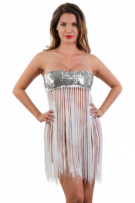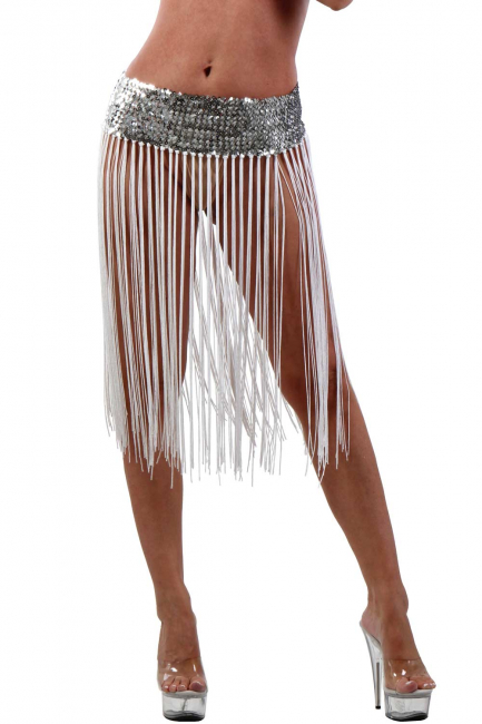 Burlesquer Fadenrock weiß und halblang mit breitem silberfarbenen Paillettenbund.