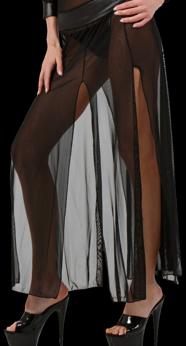 Burlesquer, langer Rock aus transparentem, schwarzem Mesh, mit einem breiten Bund in Wetlook-Material und viermal hochgeschlitzt, 2x vorn, 2x hinten