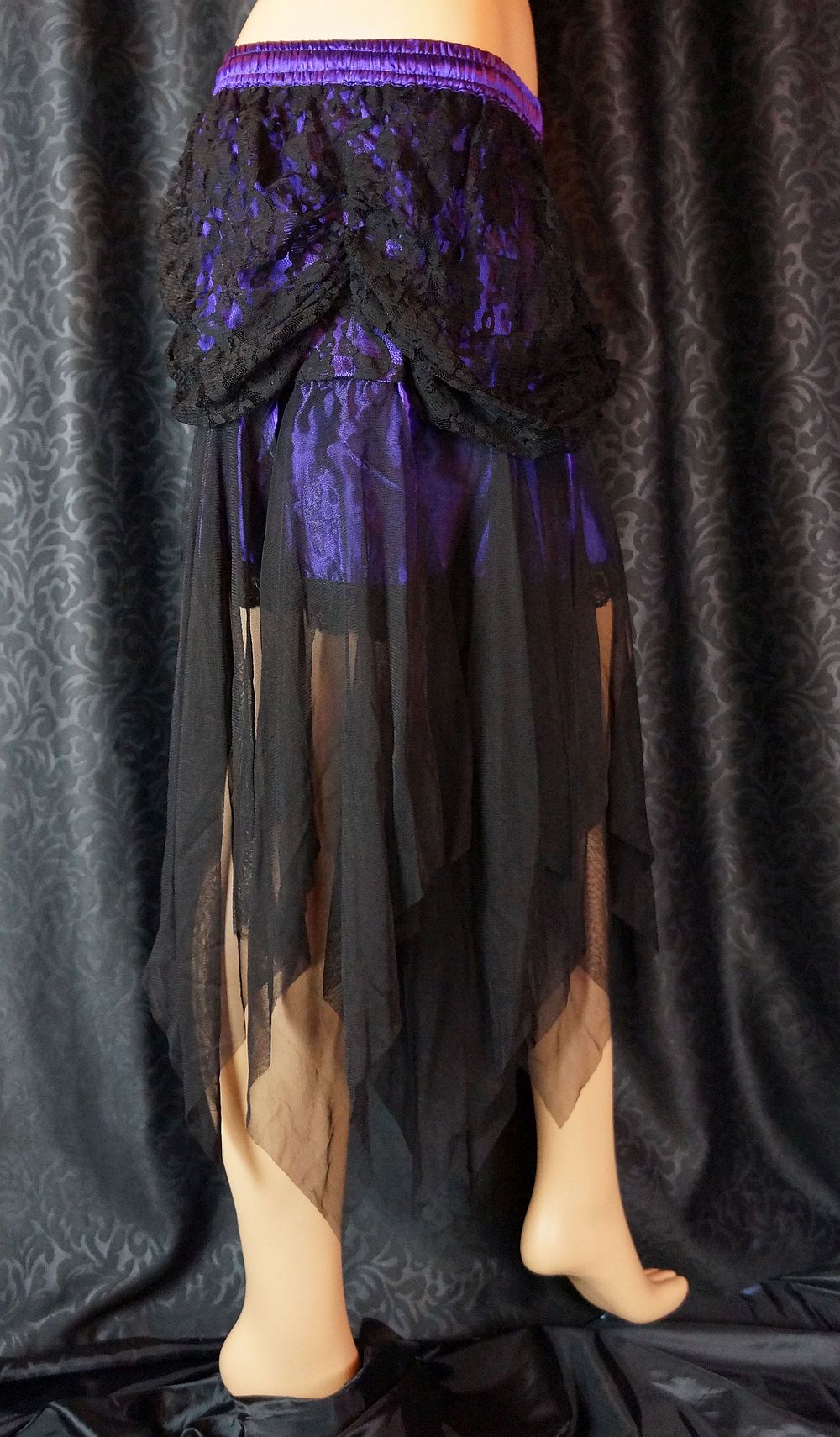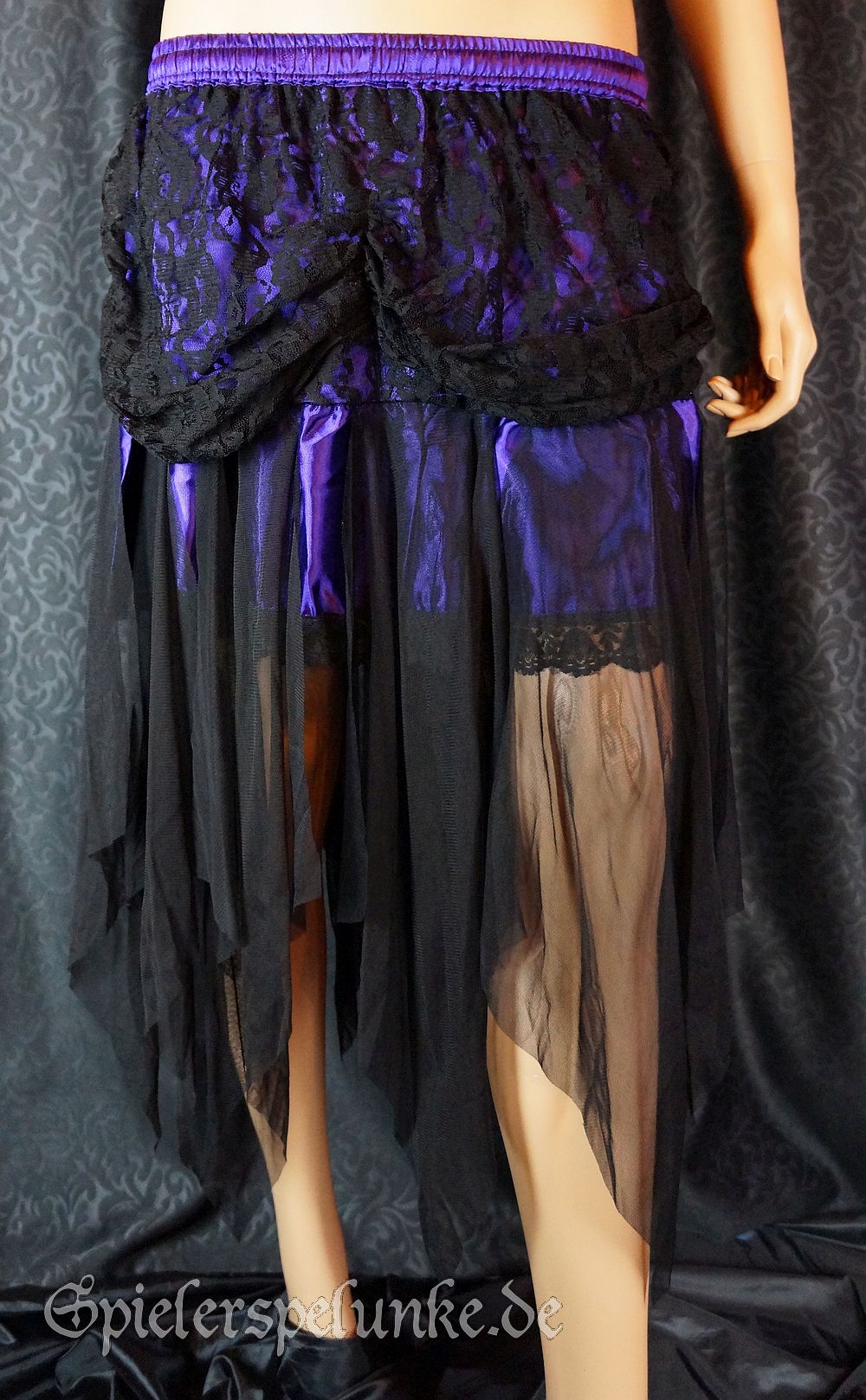 Perfekt für Gothic und Burlesque: Minirock aus lila Satin mit langem schwarzem Spitzen Overlay und schwarzem Spitzen-Volant. Oben hat der Minirock einen Gummizug und ist dadurch in Onesize-Größe verfügbar. Flach ausgelegt hat der Rock ein Bundmaß von 34cm und eine Länge von 80cm an der längsten Stelle.