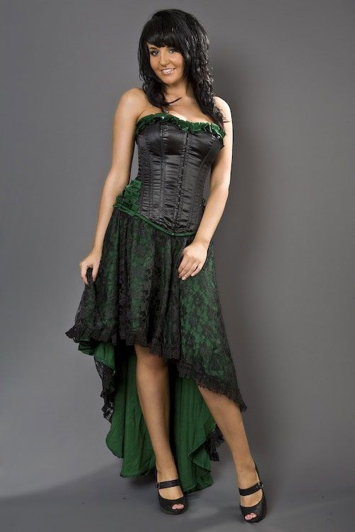 Grüner Satinrock "Elyzium" mit schwarzer Spitze mit floralem Muster überdeckt