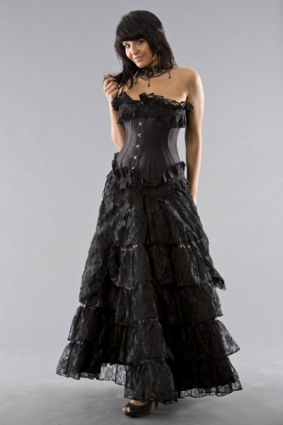 Langer schwarzer Rock im viktorianischen Stil aus schwarzem Satin mit schwarzem Spitzen Overlay