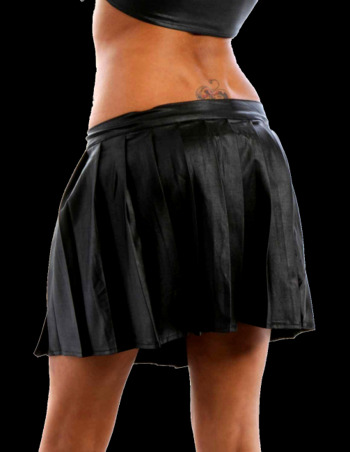 Raffinierter Wetlook Faltenminirock schwarz mit verstellbarem Bund über eine dekorative Reihe an verchromten Druckknöpfen.