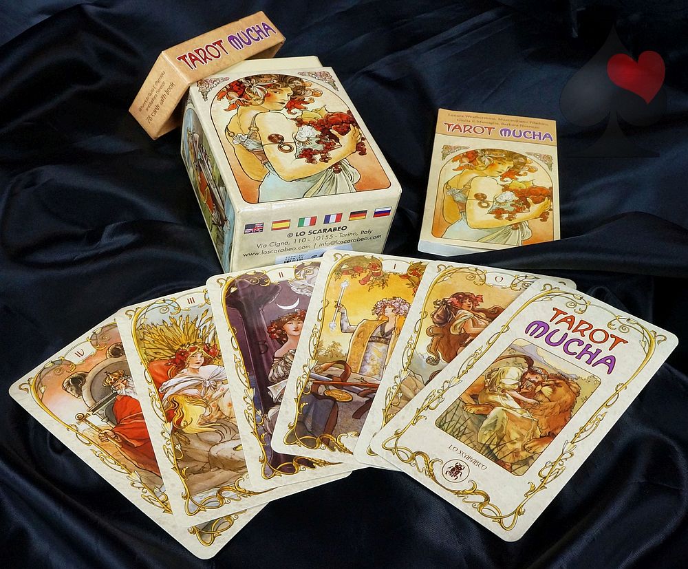Sehr exclusiver Tarotkartensatz im stabilen Schuber mit mehrsprachigem Anleitungsheft. Die berühmten Jugendstilmotive von Alfons Mucha sind die Inspiration für diesen außergewöhnlichen Tarotkartensatz zu Ehren des Meisters.
