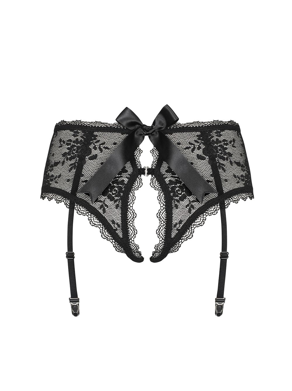 Breiter Garter Belt oder Strapsgürtel aus schwarzer Spitze mit floralem Muster, hinten und im Schritt offen, schwarze Satinschleife hinten, mit vier verstellbaren Strumpfriemchen. Strümpfe sind nicht enthalten, können aber separat bestellt werden.
