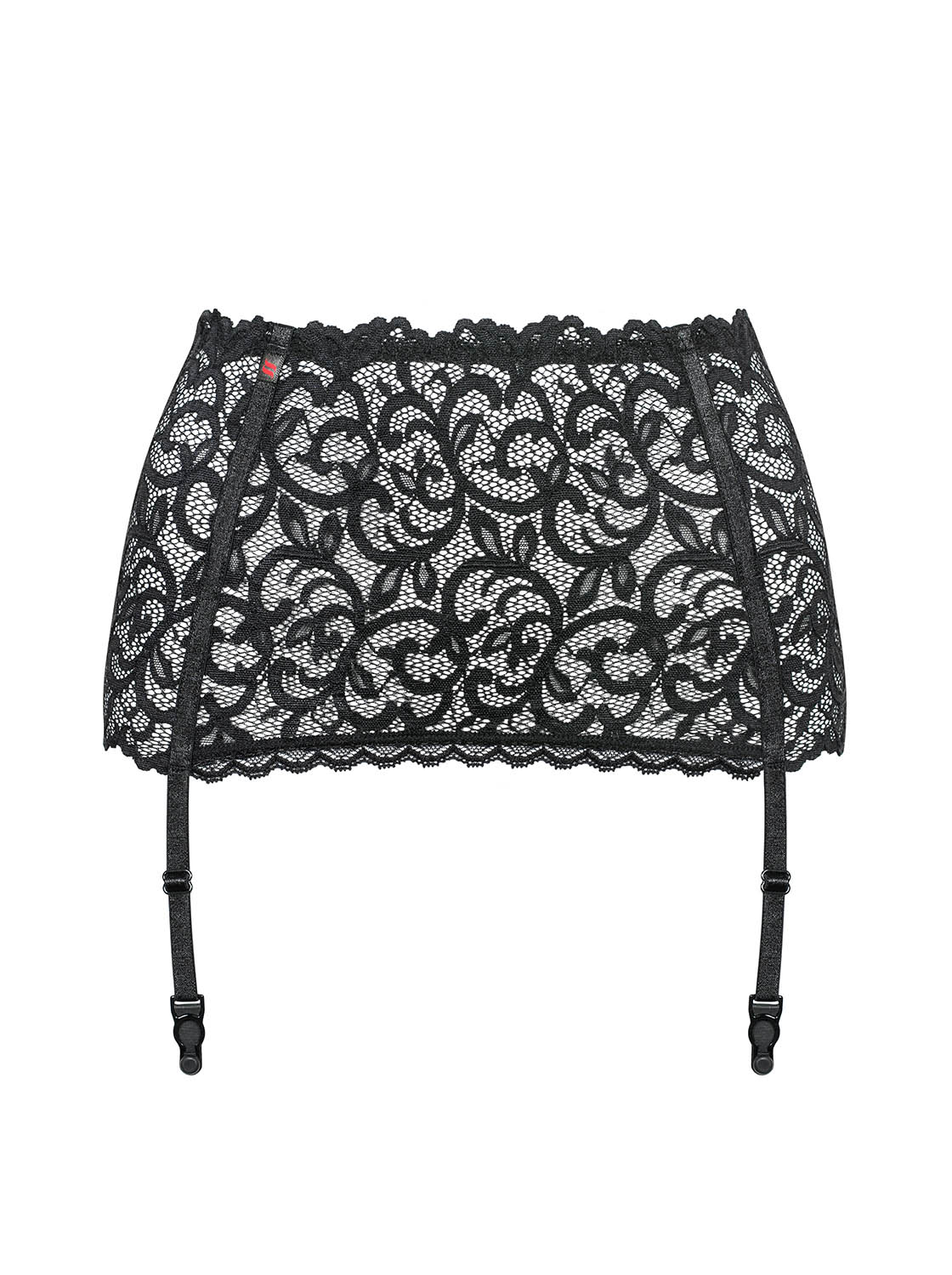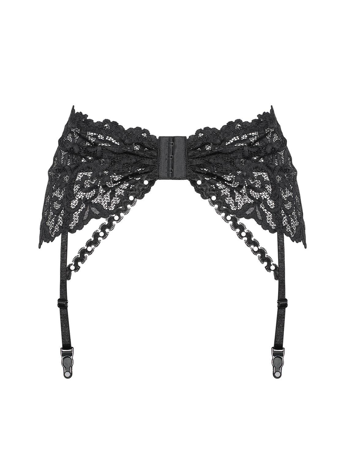 Highwaisted Garter Belt oder Strapsgürtel aus schwarzer Spitze, extrabreit mit floralem Muster, hinten mit feinen Riemchen und Perlenschmuck versehen, mit mehrstufigem Verschluß und vier verstellbaren Strumpfriemchen. Strümpfe sind nicht enthalten, können aber separat bestellt werden. Ein passender String ist inklusive.