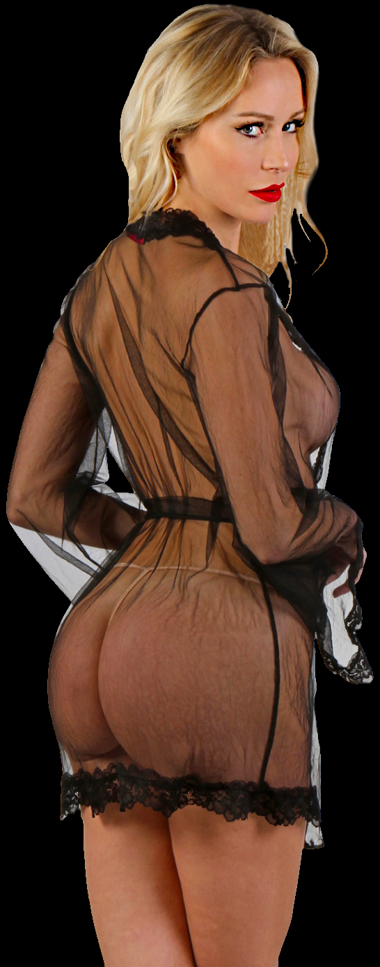 Sehr transparenter Kimono aus schwarzem Tüll, an den Rändern mit schwarzer Spitze besetzt und mit langen Trompetenärmeln versehen. Mit einem Taillenband kann der Kimono vorn gebunden werden,