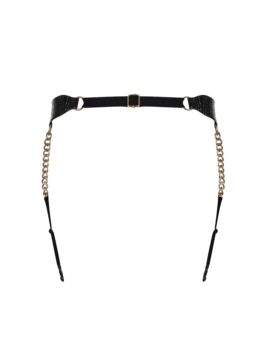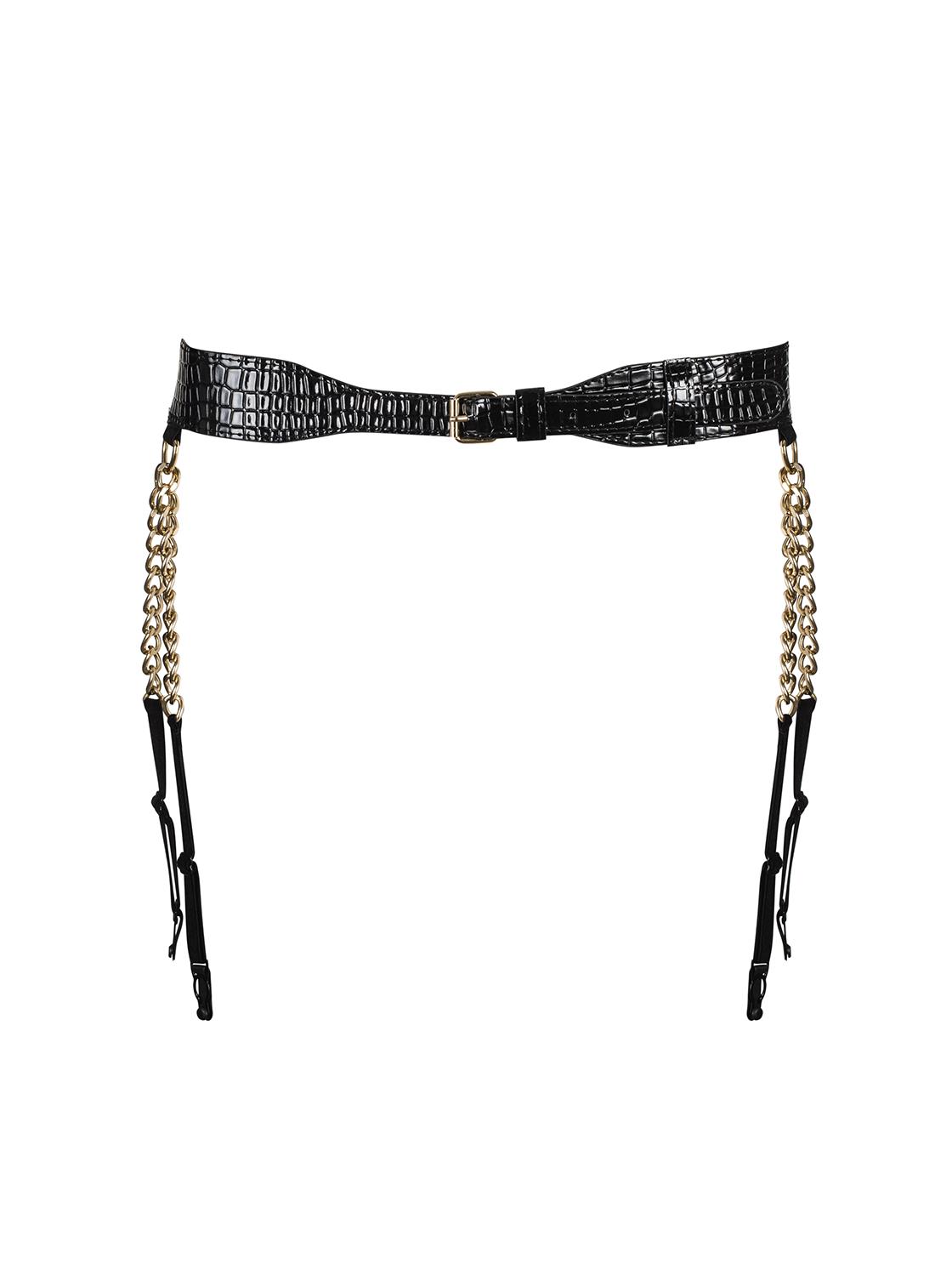 Strumpfhaltergürtel aus weichem, geprägtem, schwarzem Kunstleder mit goldfarbenen Schnallen, Ösen und Ketten für einen besonders exotischen Look.