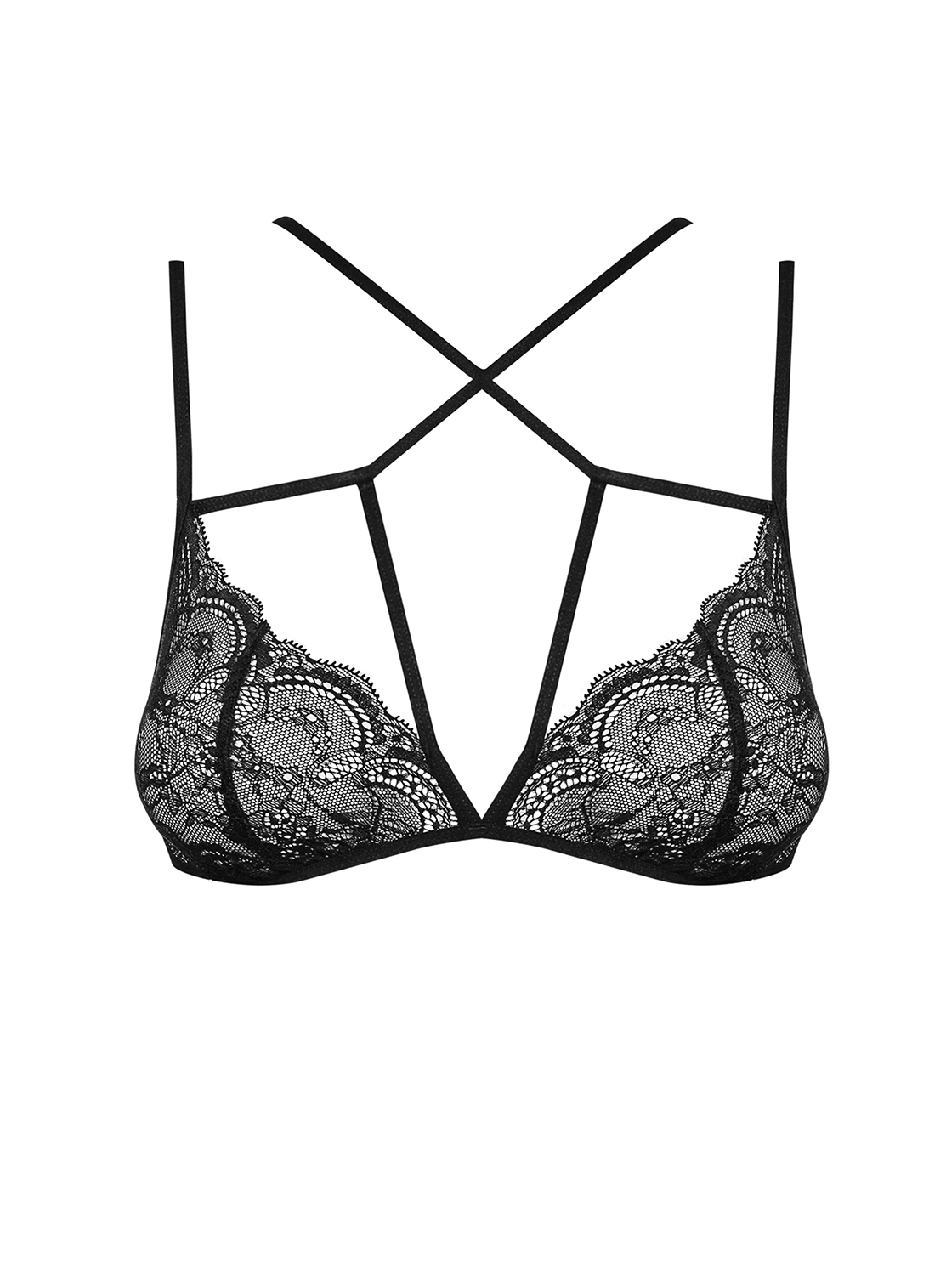 Schwarzer Spitzen BH aus weichem und elastischen Material mit trendy und sexy Riemenoptik im Dekolleté. Unter einer Bluse getragen lenken die Riemchen die Blicke wie von selbst... Der BH kann mit verstellbaren Trägern und einem mehrstufigen Verschluss perfekt der Passform angepasst werden.